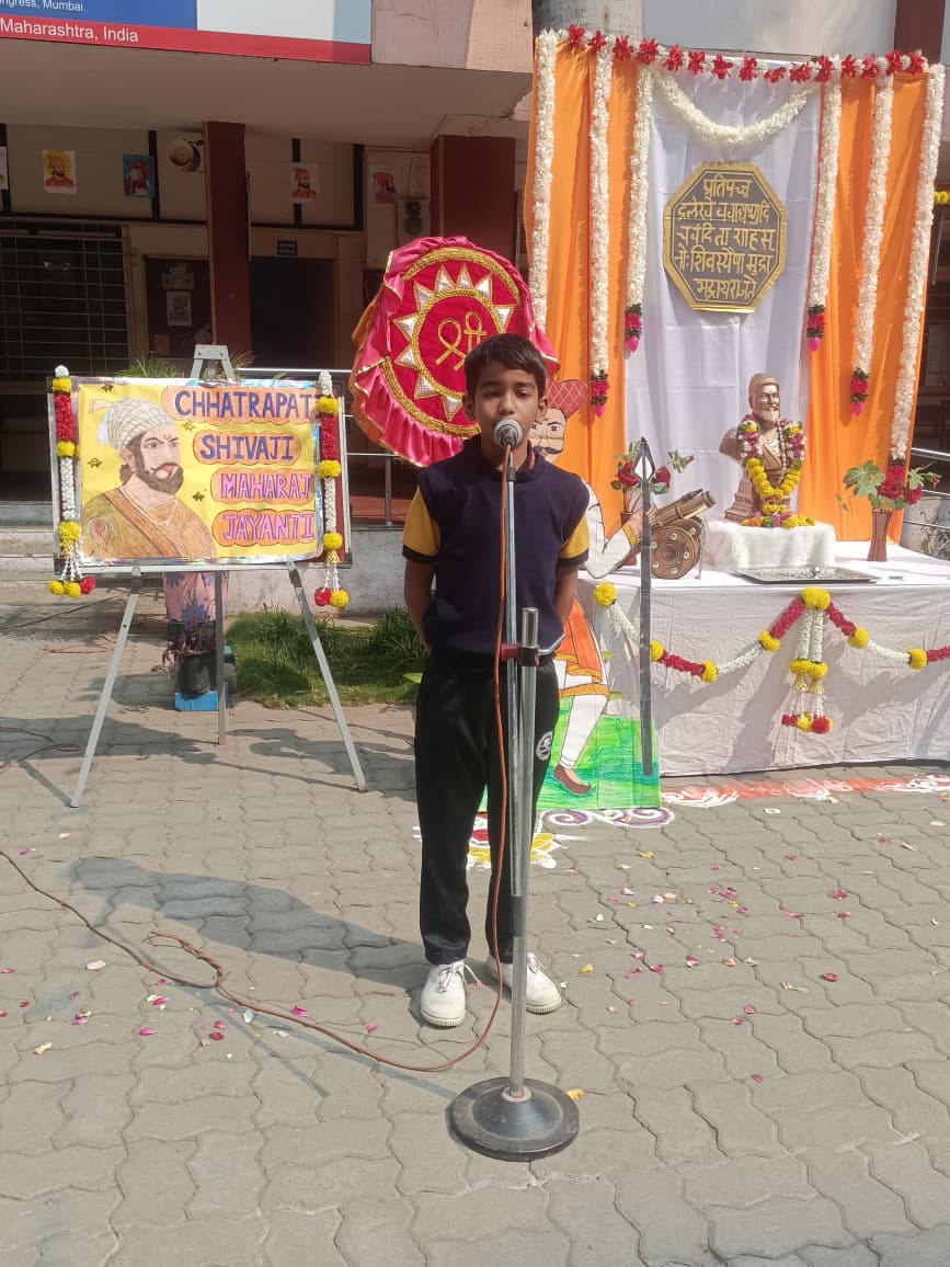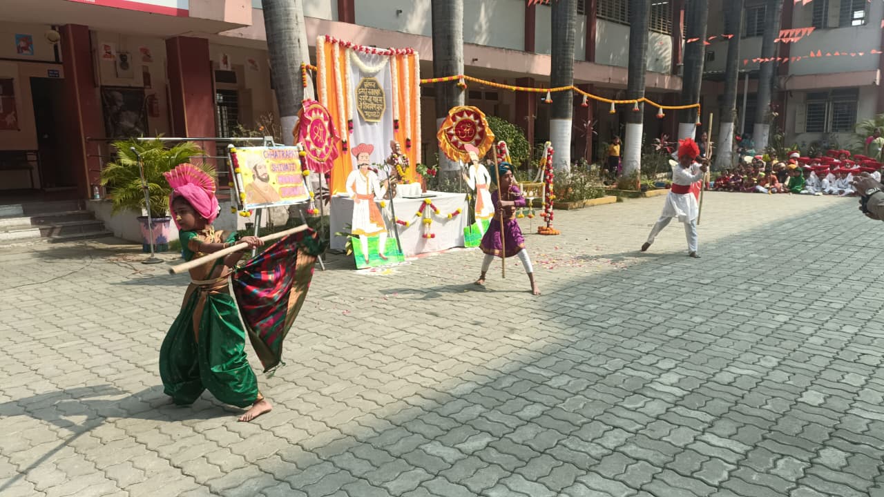 The celebration continued with energetic performances where students showcased their talents in various martial arts such as Lathi-Kathi, sword fighting, and Dandpatta, reflecting the bravery and valor associated with the Maratha warriors. Students also presented vibrant dance performances dressed as Mavalas, adding color and enthusiasm to the event. Students of Standard IV delivered meaningful speeches highlighting the life, achievements, and ideals of Shivaji Maharaj. They also presented a traditional powada, passionately singing praises of the great king and filling the atmosphere with pride and inspiration.